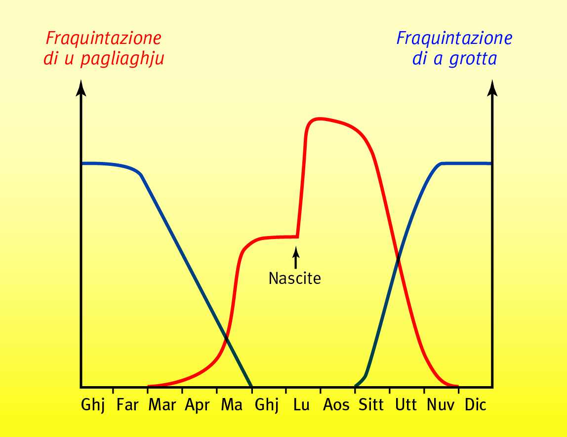 Variazione di a fraquintazione d’un pagliaghju è d’una grotta di u curtinese indi l’annu (I dui graffichi ùn sò micca in prupurzione chì i rinoloffi sò belli più numarosi in li pagliaghji cà in le grotte).