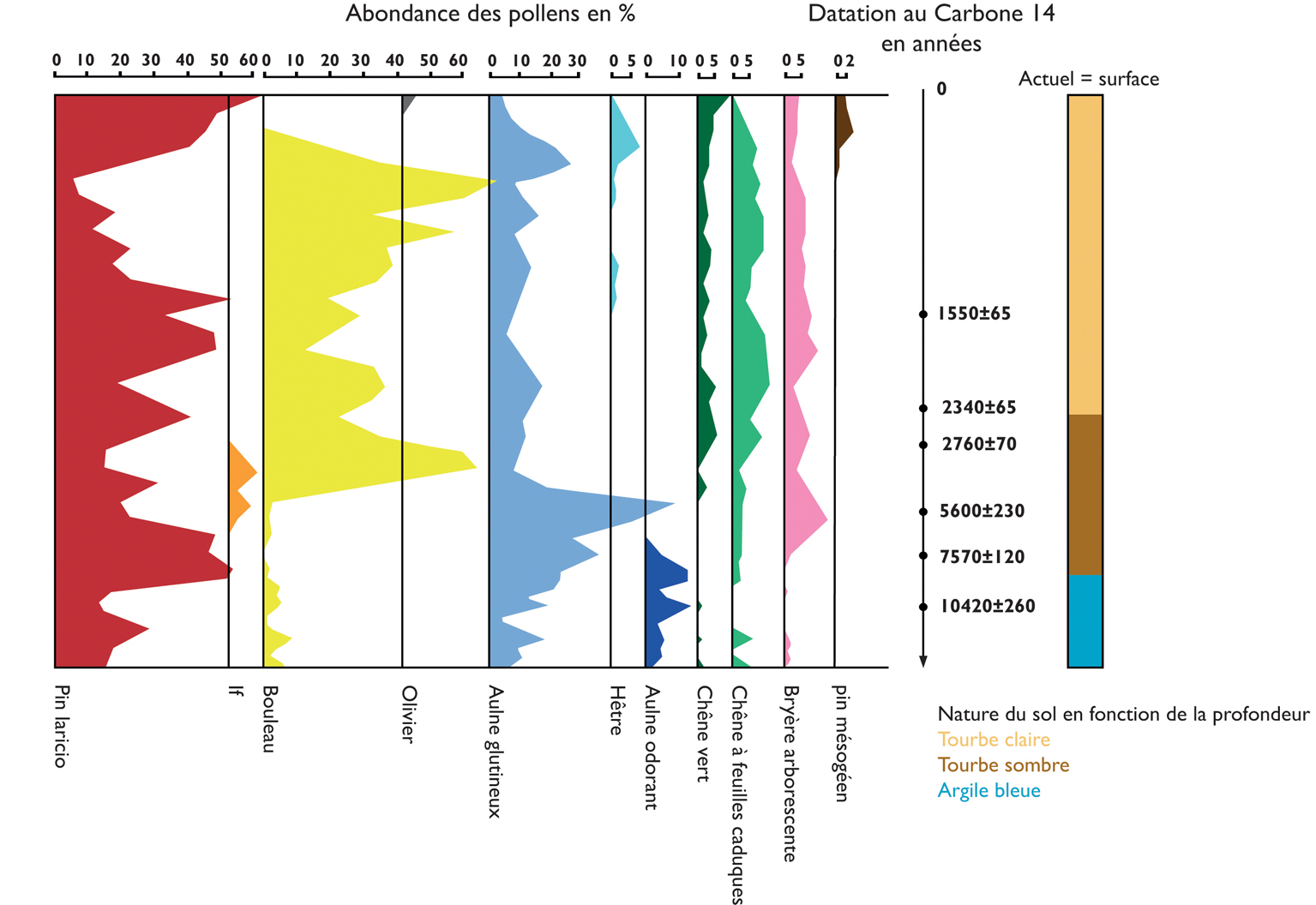 L’analyse du diagramme pollinique réalisé a mis en évidence depuis 12 000 ans une succession d’épisodes froids et secs et d'autres, plus chauds et humides. La disparition du bouleau, le développement du pin laricio, de l’olivier et du pin mésogéen (maritime) témoignent ainsi de la dernière période de réchauffement climatique.